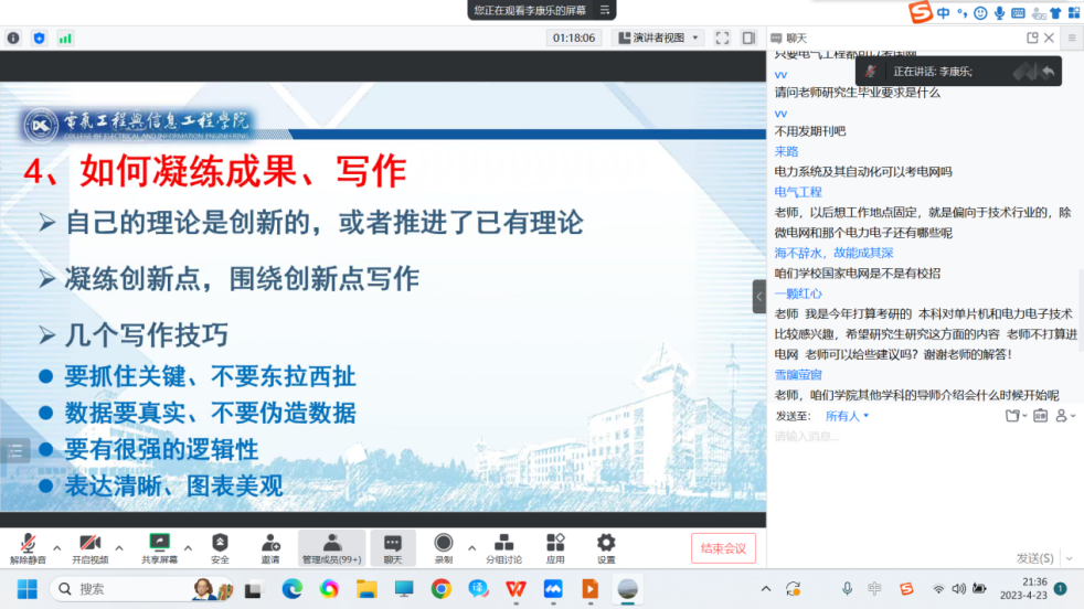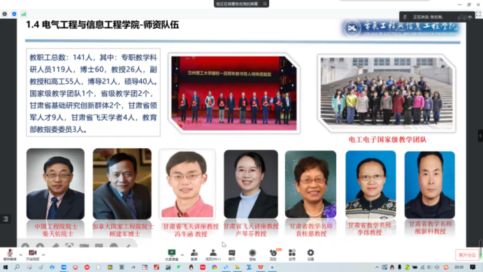 的基本情况和电信a片网的发展历史,然后对电气工程学科和专业建设、师资队伍、实验室条件、创新创业、社会服务和成果转化、研究生报考和录取等情况进行了详细介绍,让拟录取研究生及大三准备考研学生全面了解了电信a片网及电气工程系的教学条件、学科实力及发展情况。最后公布了电气工程系硕士生导师联系方式,动员2023级拟录取硕士和导师尽快完成预双选,以便于充分利用好读研前的这段时间,尽早投入到研究生阶段的学习准备中,为三年研究生求学生涯打好基础。
