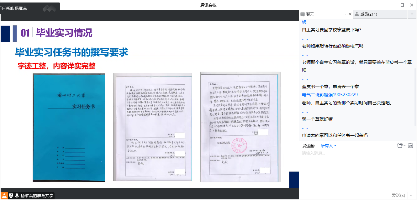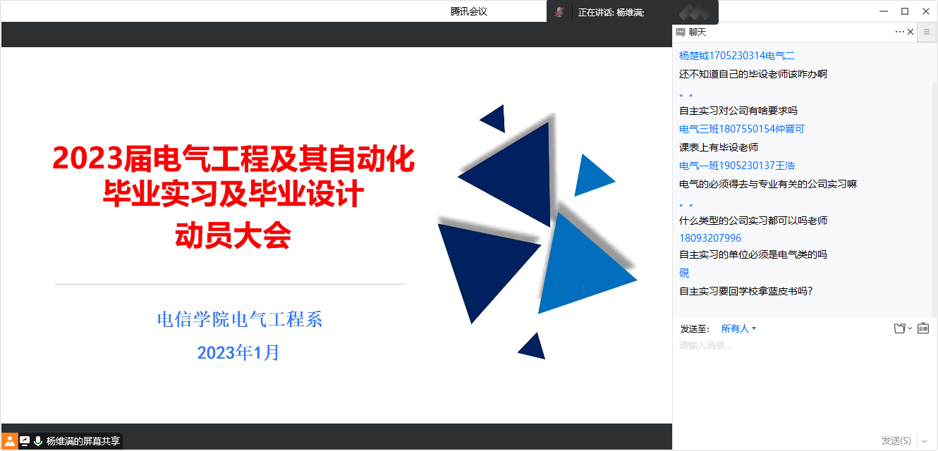 1月12日上午,电信a片网电气工程系面向2019级电气工程及其自动化专业毕业生召开了毕业实习、毕业设计线上动员大会。电气工程系副主任杨维满、实习指导老师代表郭永吉、魏占宏三位老师以及19级电气工程及其自动化专业全体学生参加了此次动员大会。此次会议由杨维满老师主持。