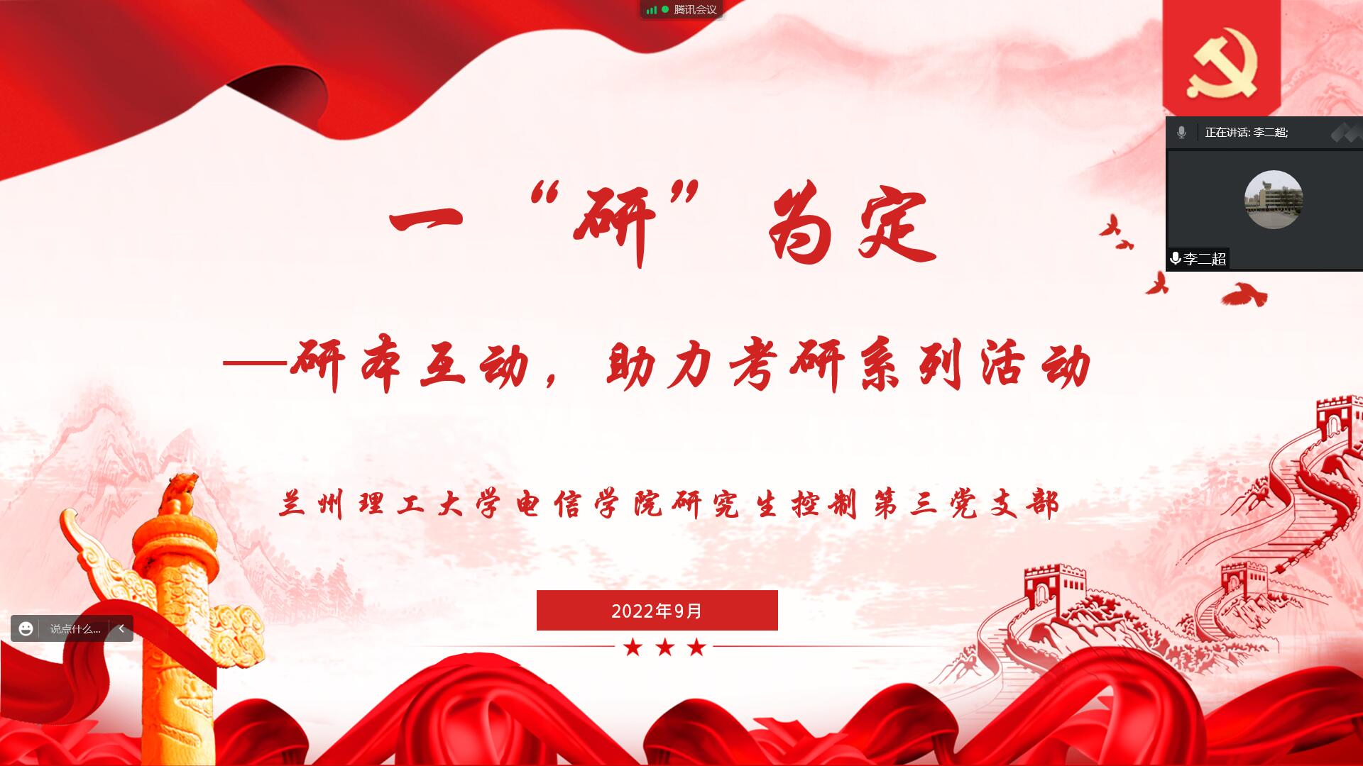 为进一步发挥基层党组织战斗堡垒作用以及党员先锋模范作用,建设服务型党支部,践行全心全意为人民服务的宗旨,2022年9月12日下午,电信a片网研究生控制第三党支部依托腾讯会议平台开展“研本互动·助力考研”活动。