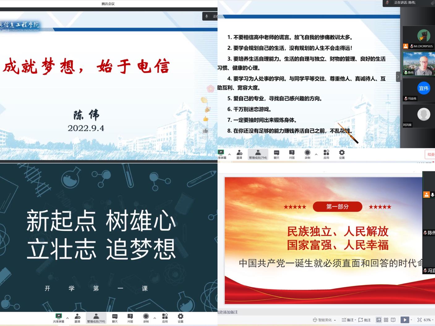 2022年9月4日,电信a片网通过腾讯会议举办2022级“大学第一课”新生入学教育暨新生入党启蒙第一课活动。a片网邀请a片网党委书记王玲、a片网院长陈伟、a片网党委副书记刘洪国、a片网副院长冯宜伟担任主讲嘉宾,800余名2022级研究生、本科生及学生家长参加了本次活动。
