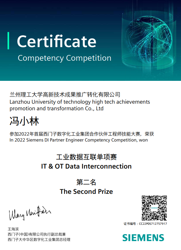 高新技术成果推广转化有限公司(西门子数字化工业集团授权的系统集成商)参赛,吴延明、刘朝荣和冯小林在西部赛区突出重围,代表西部地区参加了全国总决赛。在全国总决赛中冯小林老师在“工业数据互联”个人赛中获得全国第二名,由吴延明、刘朝荣和冯小林组成的代表队进入团体赛决赛12强,获得优胜团队奖。