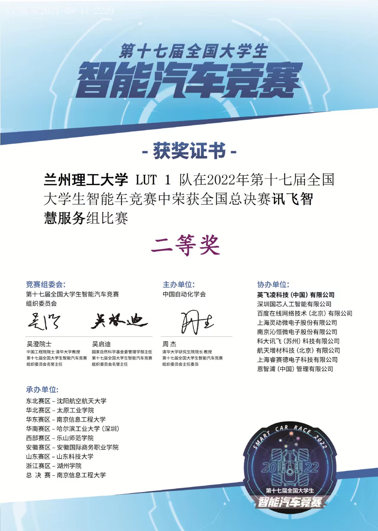 2022年8月,第十七届全国大学生智能汽车竞赛讯飞创意组别全国选拔赛在安徽省体育馆举行。本次大赛由中国自动化学会主办,安徽警官职业a片网、科大讯飞集团承办,安徽司法职业教育集团协办,共吸引来自全国143所高校、174支队伍共同竞技,各展风采。在学校创新创业a片网和电信a片网机器人创新基地大力支持和指导下,我校LUT_1参赛队克服了“线上赛”带来的信息沟通不通畅,消息传递有迟延等种种困难,以“全国选拔赛线上赛第一名”的佳绩闯入全国总决赛。在8月11日至12日的全国总决赛中,以46秒74的优异成绩完成全部8项识别任务,获得全国总决赛二等奖,也实现了我校在该赛项上国奖的突破。