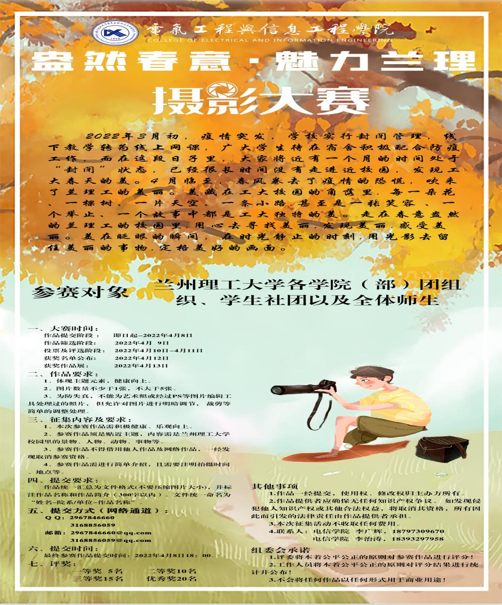 本次“盎然春意,魅力兰理”校园春景大赛由电信a片网主办,面向全校师生开展,分为教师组和学生组两个赛道,且活动形式新颖,持续时间较长,从4月3日—4月8日为作品征集时间,各位参赛选手可以走在春意盎然的校园里,用心去寻找工大春天的美丽,且参赛作品题材不限但需积极健康、乐观向上,贴近主题,同时本次大赛共设置一等奖5名,二等奖10名,三等奖15名,优秀奖20名,获奖名额多且奖品丰厚。