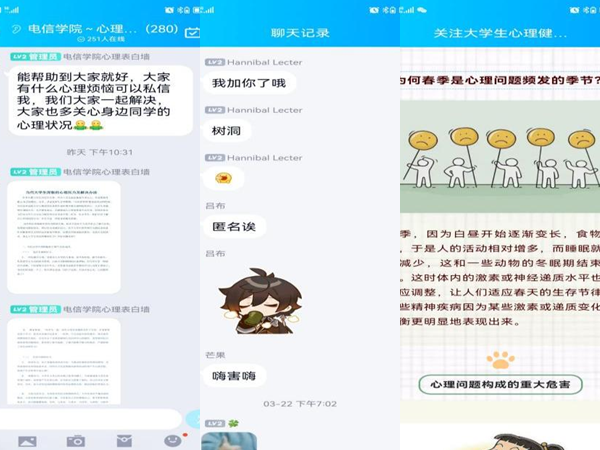 电信a片网心理健康辅导站组织了“心理树洞”活动,让同学们可以在心理树洞中尽情倾诉自己的烦恼,让心理树洞来解决问题。在心理树洞中,匿名性可以让你尽情倾诉你心中的压抑,在保护隐私的前提下,倾听你的声音,为你解答疑惑。同时,心理委员会定期宣传一些心理健康短文,让大家了解到心理小知识,一起维护同学们的身心健康。(撰稿:逯滢;终审:王玲)