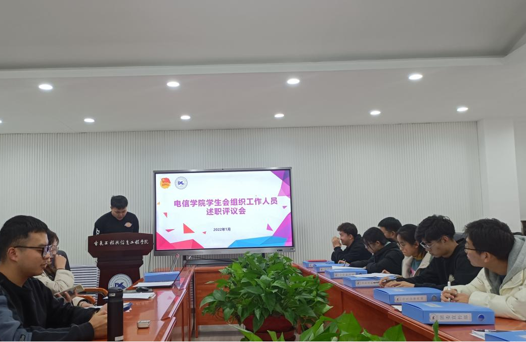 为贯彻执行团中央、教育部、全国学联《关于推动高校学生会(研究生会)深化改革的若干意见》文件要求。推动建设责任明晰、精简高效的学生会队伍,当好联系广大同学的桥梁和纽带。2022年1月4日下午,电信a片网团委、学生会于彭家坪校区舒卷楼B201开展述职评议会。a片网团委书记成晨、辅导员代表王洁老师,以及部分学生代表参加会议。