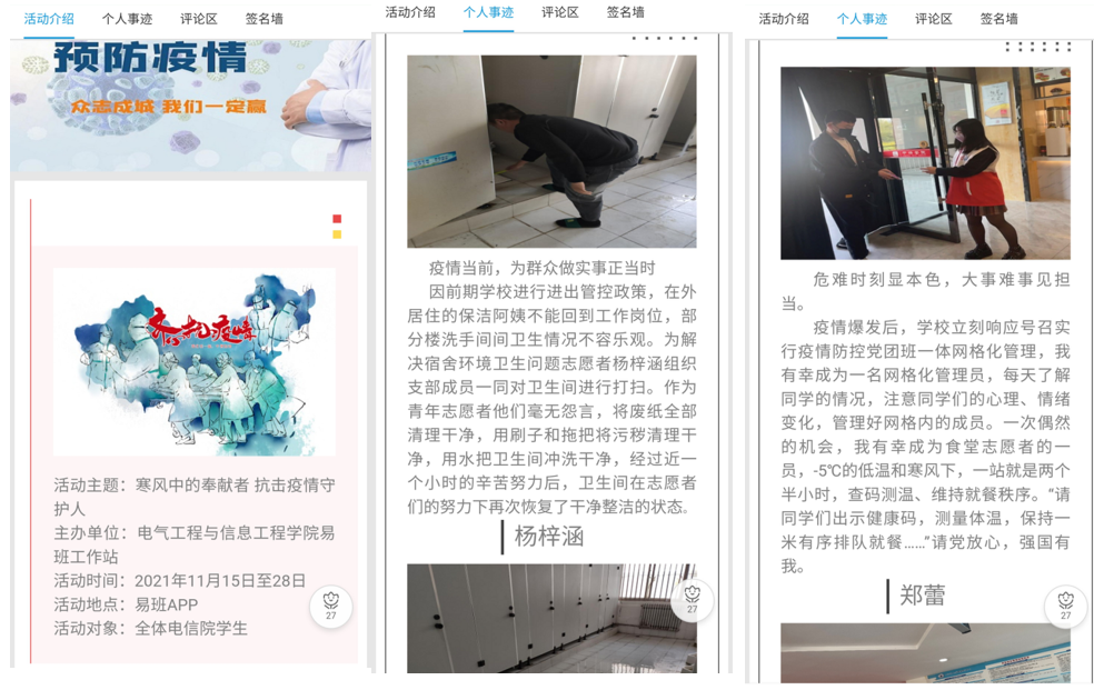 为进一步激发学生的责任担当,坚决打赢疫情防控阻击战,弘扬战“疫”正能量,电信a片网依托易班平台开展“寒风中的奉献者 抗击疫情守护人”主题志愿者事迹征集活动。全院学生踊跃参与,主题宣传效果显著。