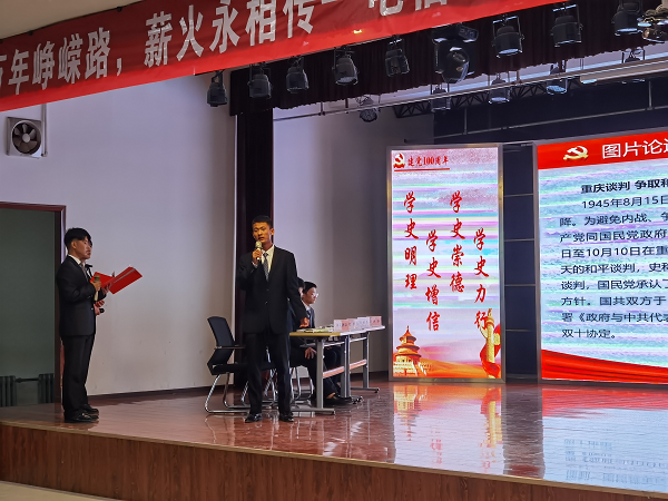 共有九支队伍参加复赛。本次复赛,设置“选择题、论述题”两个环节。内容以党史为主体,涉及知识面广、趣味性强。选择题阶段各参赛队伍充分展示了对党史知识的扎实学习。论述题阶段分为图片题和视频题,面对随机给出的党史图片与视频,选手们思考片刻后便进行了饱含深情的讲述,表达了自己对党史的深刻认识与理解。参赛选手们精神饱满、沉着应对、积极作答,展现了扎实的党史知识储备、过硬的心理素质、融洽的团队协作。