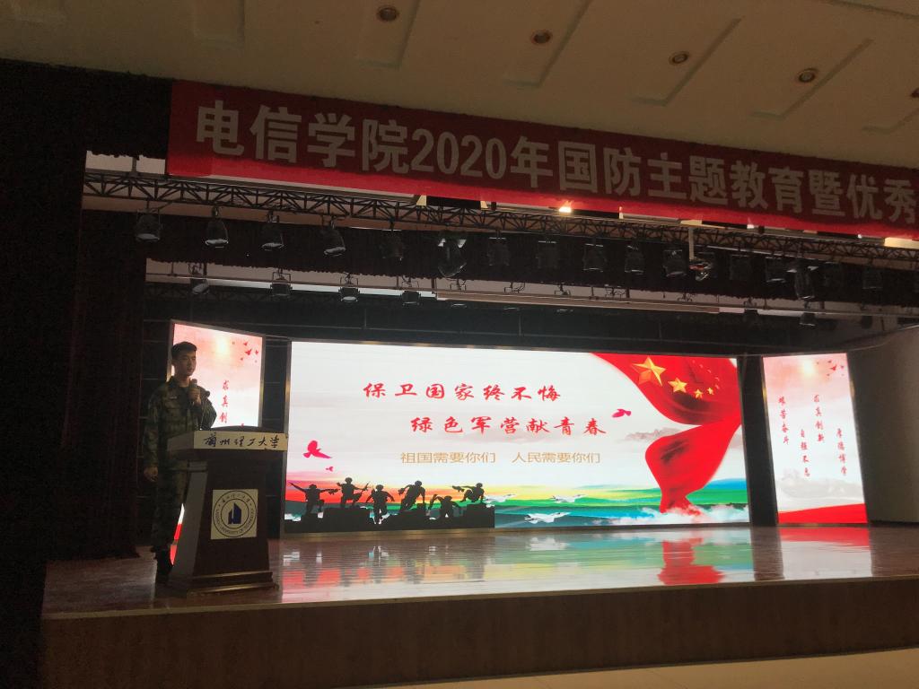 11月12日晚,电信a片网于彭家坪校区大学生活动中心顺利举办2020年国防主题教育暨优秀退伍大学生事迹宣讲会。学校学生学业发展指导与国防教育中心唐洪川主任,a片网优秀退伍大学生代表达选财、李林、刘泽润、何小强、张玉祥等五名同学,a片网辅导员李婷、成晨老师以及各年级学生代表共300余人参加活动。