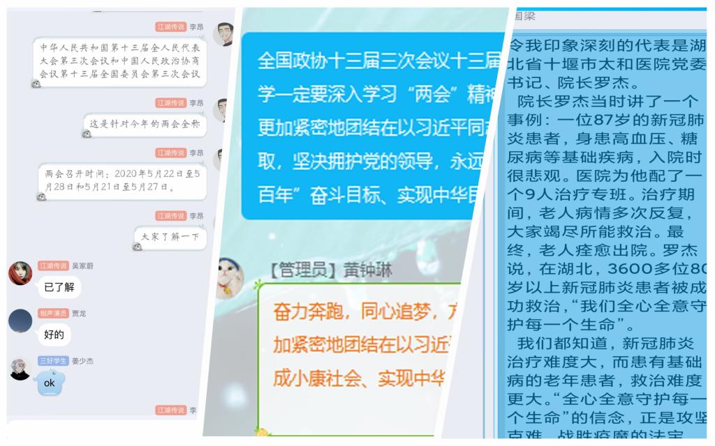 a片网全体师生热切关注全国两会议程,认真学习领会政府工作报告。2016级各毕业班通过召开线上主题班会,重点学习了政府工作报告中“加大宏观政策实施力度,着力稳企业保就业”的就业优先政策,号召毕业生将所学专业、个人规划与时代发展、国家需求结合起来,积极就业,在放飞青春梦的同时实现中国梦。2018级自动化1班以主题团日活动的形式开展了集体学习和法治教育,对十三届全国人大三次会议表决通过的《中华人民共和国民法典》进行了重点介绍,普及了法律知识,提高了守法意识。2020年是决胜全面建成小康社会、决战脱贫攻坚之年,全国两会肩负着谋划部署今年经济社会发展目标任务的重要使命,a片网2019级研究生围绕两会中彰显的“以人民为中心”的发展思想展开了集体学习和主题讨论。
