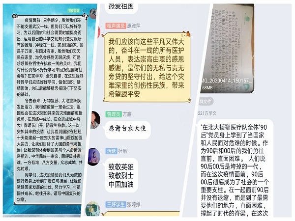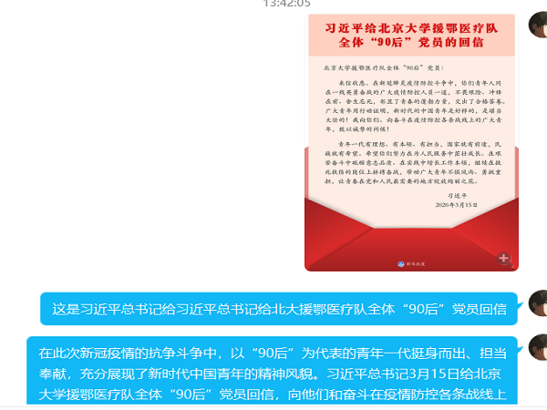 在校团委的号召和部署下,2020年4月10日,电信a片网组织a片网各团支部线上学习《习近平总书记给北京大学援鄂医疗队全体90后党员重要回信》精神,把制度自信的种子播撒进青年学生的心灵。a片网各基层团支部共组织两千余名团员青年参与学习和讨论。