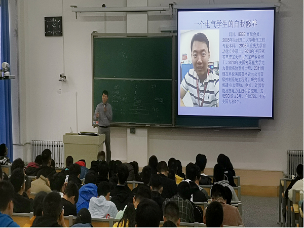 闫川博士首先根据国内外现状,详细分析了电气行业的未来和前景,然后结合自己的发展历程,从如何做好职业规划,应对未来职业挑战,如何做好读研和出国深造的准备等方面做了一场别开生面的讲座,特别是对在大学阶段如何提高英语水平、如何提高解决问题的能力和综合素质等问题给予了建设性的意见。闫川博士讲述了自己在国内外的求学和工作经历,分享了考研与就业该如何抉择等方面的经验,为在场的同学们提供了宝贵的人生建议。讲座后,与现场学生进行热烈交流互动,认真回答了学生的问题,闫川博士精彩幽默的回答引来了学生热烈的掌声。