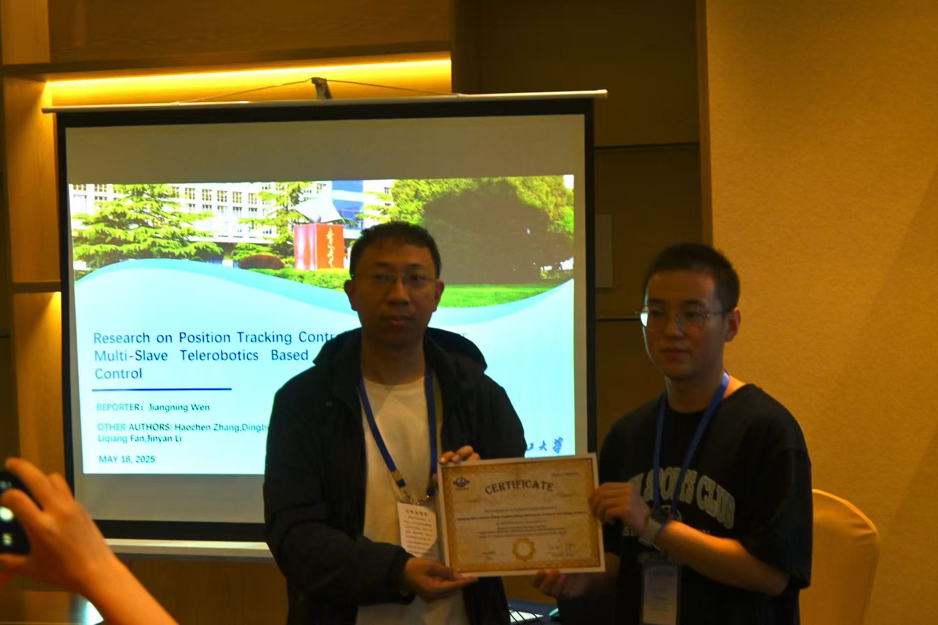 2023级研究生温江宁代表课题组做了题为“Research on Position Tracking Control of Single-Master Multi-Slave Telerobotics Based on Adaptive Robust Control”的分会场报告,该工作针对多机器人协同控制提出了一种改进的交互控制架构。