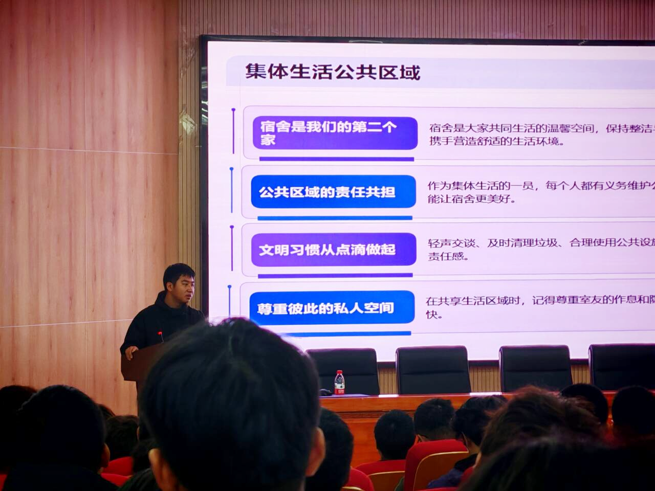 随后,洪振涛老师就“一站式学生社区管理与宿舍安全”进行专项讲解,介绍了“一站式”学生社区在生活服务、学业支持与文化育人方面的功能,并重点结合违规电器使用、消防安全隐患、作息规范等宿舍常见问题,通过案例解析强调了遵守宿舍管理规定的重要性,期望新生们携手营造安全、和谐的生活空间。