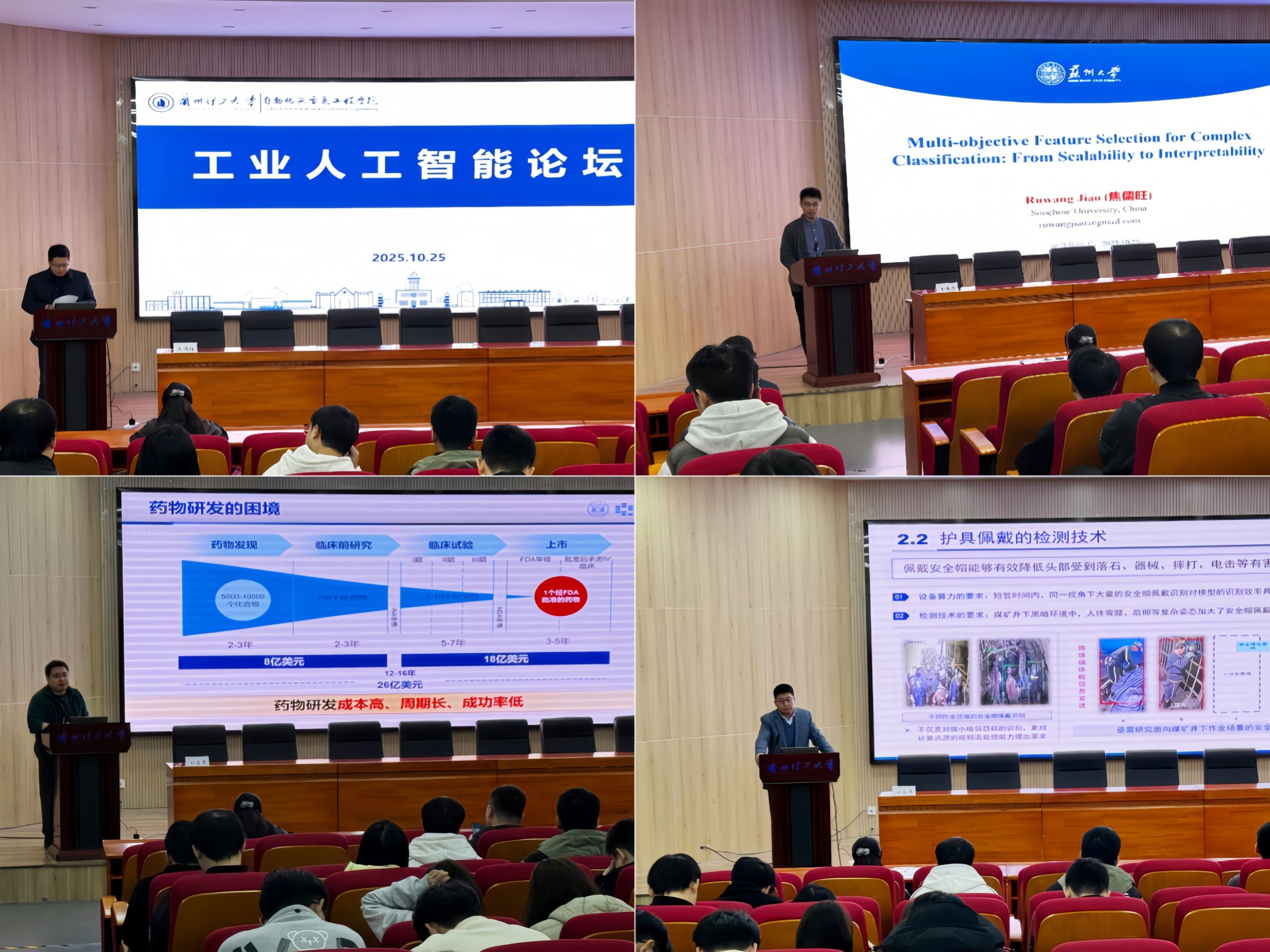 焦儒旺教授以《面向复杂分类任务的多目标特征选择:从可扩展性到可解释性》为题,系统阐述了特征选择在应对“维数灾难”中的关键作用及其面临的多重挑战,并分享了团队在可扩展性与可解释性研究方面的最新进展。刘益萍教授在报告《智能药物分子设计与合成》中,重点介绍了多目标分子生成与合成路径预测的创新方法,生动展示了人工智能在药物研发中的跨学科应用实践。左明成副教授则以《智慧矿山建设中的典型问题和AI解决方案》为题,深入探讨了AI技术在打通数据孤岛、提升矿山安全与生产效率方面的实际案例与解决方案。