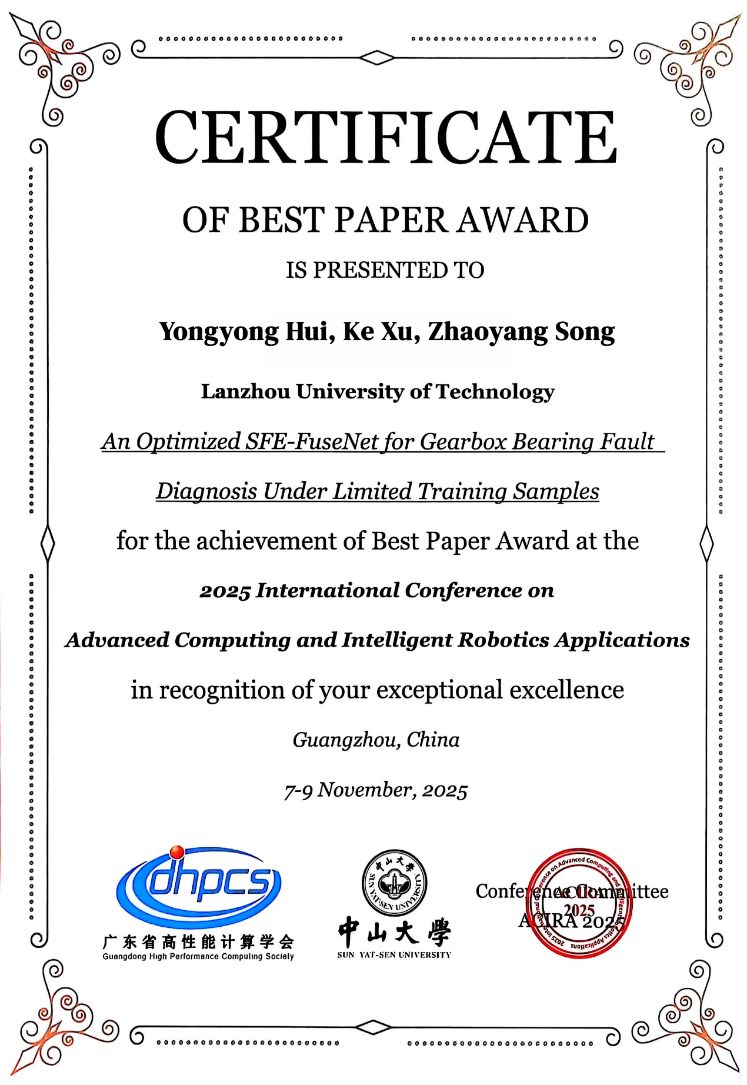 青年教师惠永永的研究成果《An Optimized SFE-FuseNet for Gearbox Bearing Fault Diagnosis Under Limited Training Samples》脱颖而出,荣获最佳论文奖。该研究创新性地融合深度网络与故障特征提取技术,有效提升了在训练样本有限条件下齿轮箱轴承故障诊断的准确率。