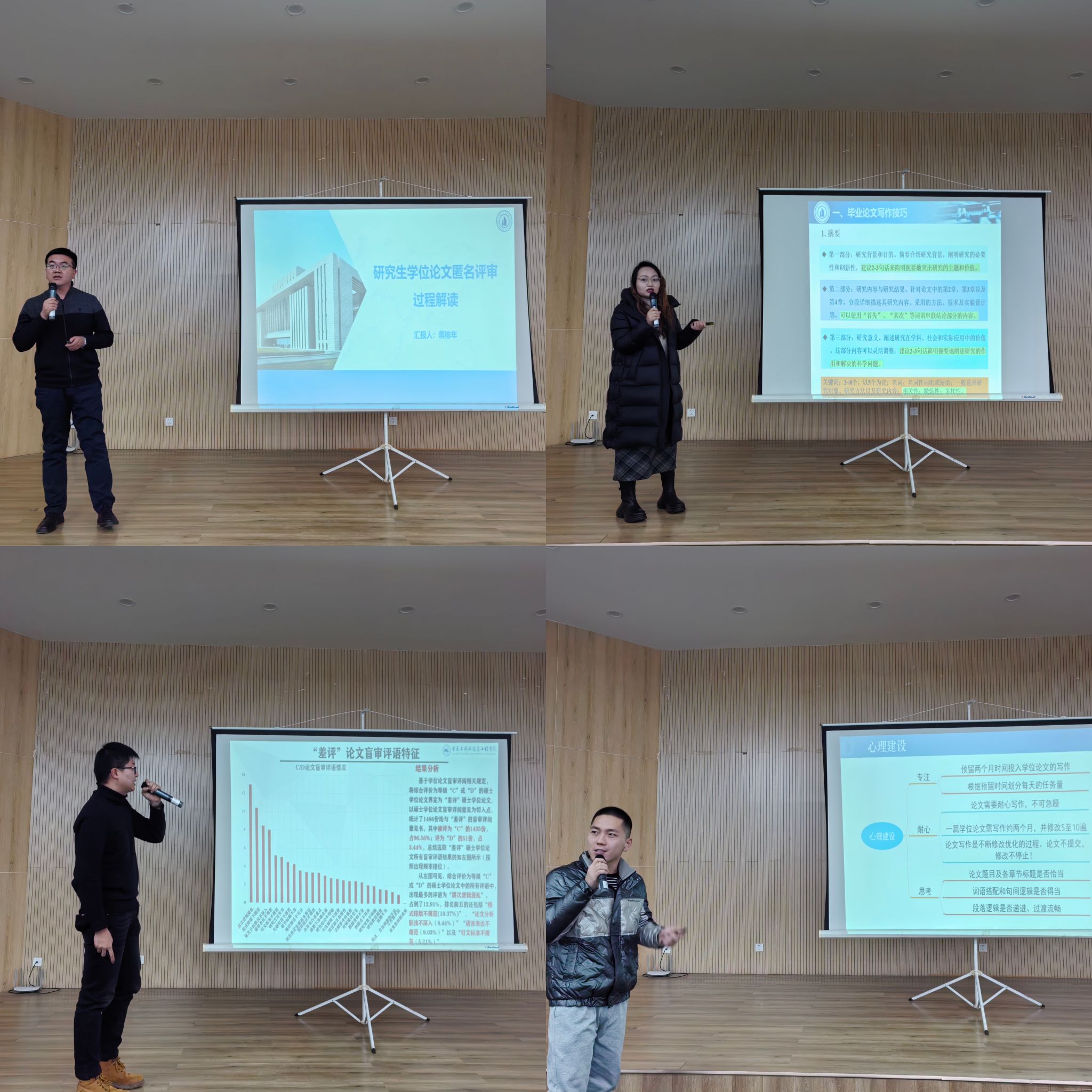 蒋栋年教授详细解读了研究生学位论文的匿名评审过程。他指出研究生需要按照规定的时间节点提交论文,并通过学校的盲审系统进行审核。评阅专家将根据论文的选题、研究方法、创新点、研究成果和写作规范等方面进行全面评估。裴婷婷副教授从论文写作技巧入手,系统讲解了毕业论文的结构及各部分写作要求。周勃博士详细分析了“差评”论文的典型特征,提醒学生在写作过程中警惕常见的写作误区,避免低质量评审结果。最后,袁山钦博士提出学生在论文写作中应保持高度专注、耐心和严谨的学术态度,并分享了论文修改的关键步骤。