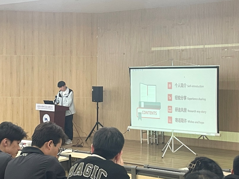 李森同学从个人经历、科研成果、学科竞赛三方面讲述了研究生三年的成长历程,讲述了论文写作的技巧和方法,面对科研工作应持有怎样的作风与态度进行两方面入手,分享了文献阅读和科研小程序使用的方法,并对参加学科竞赛进行了详细的指导。李森同学在最后也讲述了自己精彩的校园生活经历,并希望研一学生拥有生活热情和对科研的激情。