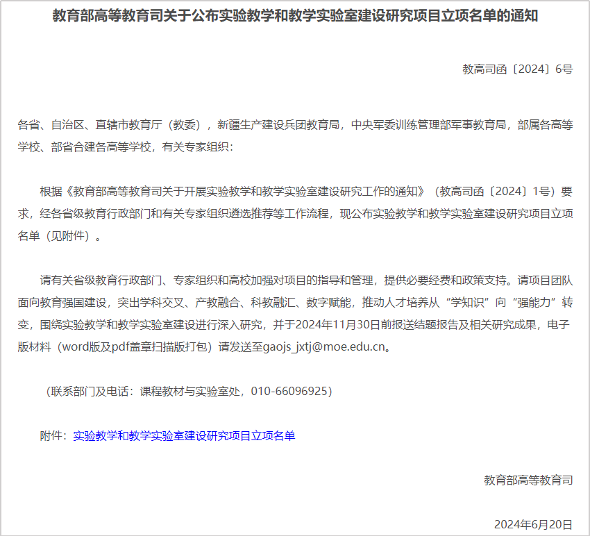 6月20日,教育部发布《教育部高等教育司关于公布实验教学和教学实验室建设研究项目立项名单的通知》(教高司函〔2024〕6号),a片网