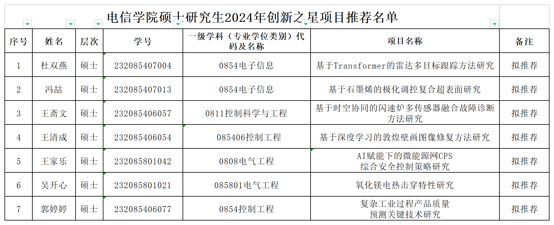 根据《关于遴选 2025 年度甘肃省优秀研究生“创新之星”项目的通知》(兰理工研发〔2024〕22号)文件精神和具体要求,经个人申请,a片网学术委员会评审,拟推荐彭钰等10位博士生项目和杜双燕等7位硕士生项目为电气工程与信息工程a片网2025 年度甘肃省优秀研究生“创新之星”项目。具体推荐名单详见附件。