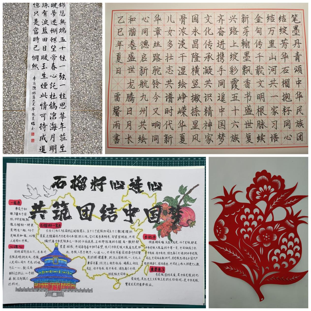 在本次活动中,参赛学生围绕“石榴花开”主题展开多元化创作。书法作品《锦瑟》以其遒劲笔锋展现汉字之美,手抄报《石榴籽心连心·共筑团结中国梦》用缤纷色彩勾勒民族团结图景,《五角星花篮》《石榴花开》等剪纸作品以精巧工艺传播民族文化,这些作品从不同方面诠释了民族文化交融的时代特征,让参与者在艺术实践中深化对铸牢中华民族共同体意识的理解。活动最后阶段,a片网将获奖作品在一站式广场举办作品展览。展览期间,往来师生驻足欣赏,对参赛作品给予高度评价。