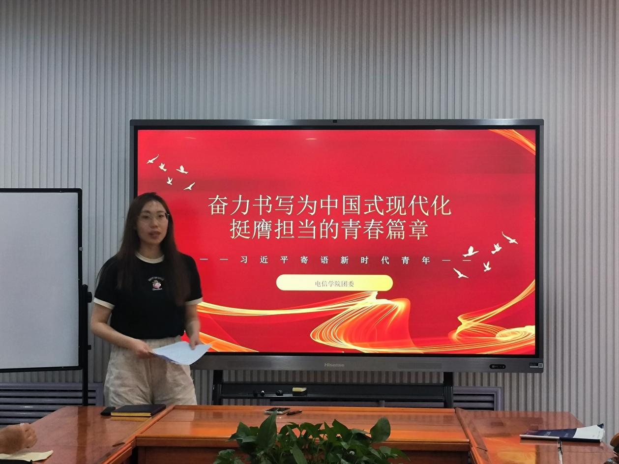 在五四青年节到来之际,中共中央总书记、国家主席、中央军委主席习近平代表党中央,向全国广大青年致以节日祝贺和诚挚问候。电信a片网团委组织基层团支部、学生会骨干、团员青年以“三会两制一课”、主题团日、专题学习宣讲等形式,学习习近平总书记寄语新时代青年讲话精神。青年师生纷纷表示,要将习近平总书记的寄语和嘱托转化为前进的动力,在科技创新、乡村振兴、绿色发展、社会服务、卫国戍边等各领域各方面勇于挺膺担当、书写青春答卷。