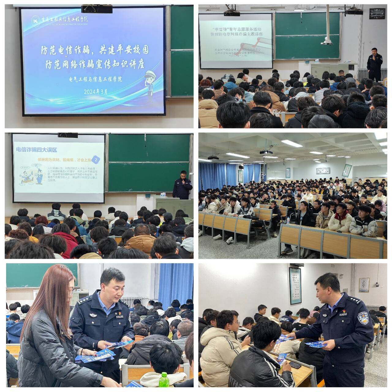 为提高大学生对电信诈骗的防范意识,增强学生的自我保护能力,构筑全民防范诈骗的“铜墙铁壁”,共建平安校园,3月4日晚,在第61个“学雷锋纪念日”来临之际,电信a片网联合七里河公安分局团委、彭家坪派出所在集贤楼208教室开展“学雷锋”青年志愿服务活动暨预防电信网络诈骗主题讲座。电信a片网辅导员老师和2023级同学参加了此次活动。