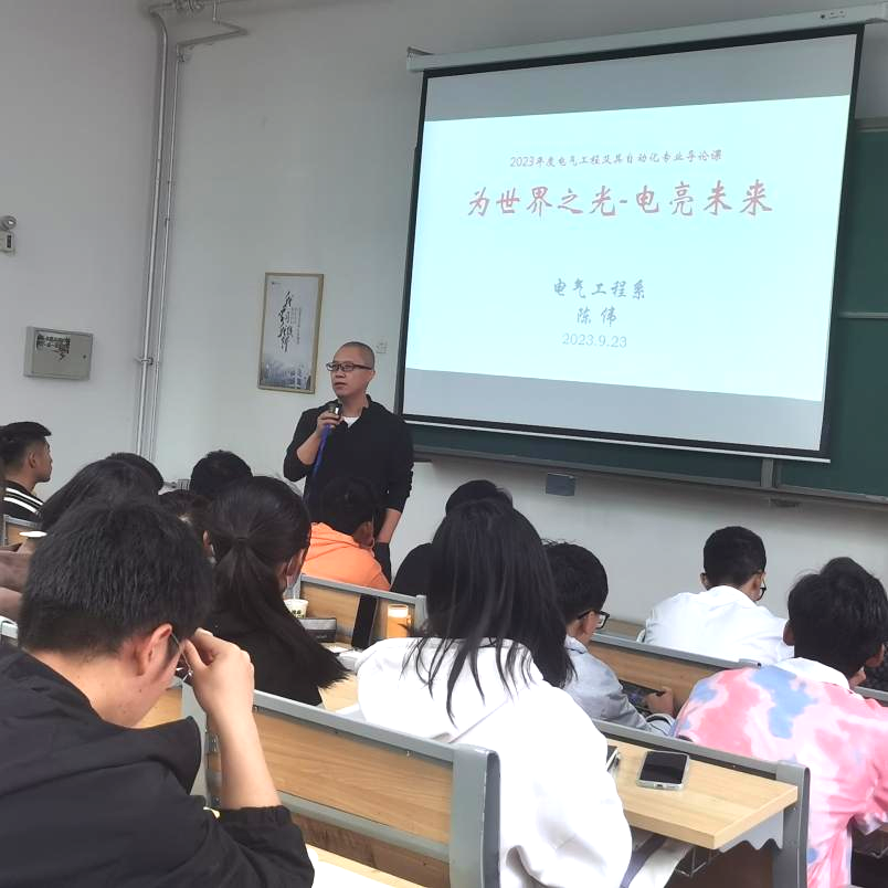 电信a片网电气工程系依托《电气工程及其自动化专业导论课》,面向全体2023级电气工程及其自动化专业本科生开展了“开学第一课”系列专业教育活动。9月23日早上,电信a片网院长陈伟教授为新生们带来了题为“为世界之光,电亮未来”的精彩报告。报告分别从“‘电气’中的气从何由来”、“电气专业(学科)的发展史”、“电气工程及其自动化专业学什么”、“我们面临的机遇与挑战”、“我们能为你们提供什么”、“四年后何去何从”等六个方面通俗易懂的介绍了电气工程及其自动化专业的整体概况。