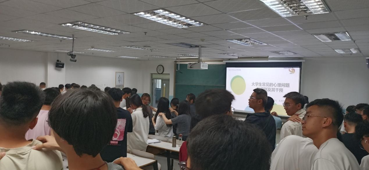 讲座开始前,孔老师先让同学们做了个简单的小游戏:同学之间互相捶背,使之进入一种放松的状态,静下心来,舒缓身体。接着进入讲座的主题,孔老师将其分为三部分展开,分别是:心理健康及其标准、大学生常见心理问题及其识别和大学生心理问题的预防和干预。孔老师指出大学生心理健康标准,分为六大主要模块供同学们参考学习。接下来孔老师着重介绍了一些典型的心理问题,对心理正常与心理异常的本质加以区分,并介绍了相应的行为表现。以抑郁症为例,抑郁症与抑郁心情完全是两回事,若不区分清楚将对自身的学习生活产生深远而巨大的影响。最后孔老师为大家介绍了几种心理问题的干预方法,比如参加心理讲座、报名心理竞赛、学习心理课程等等。