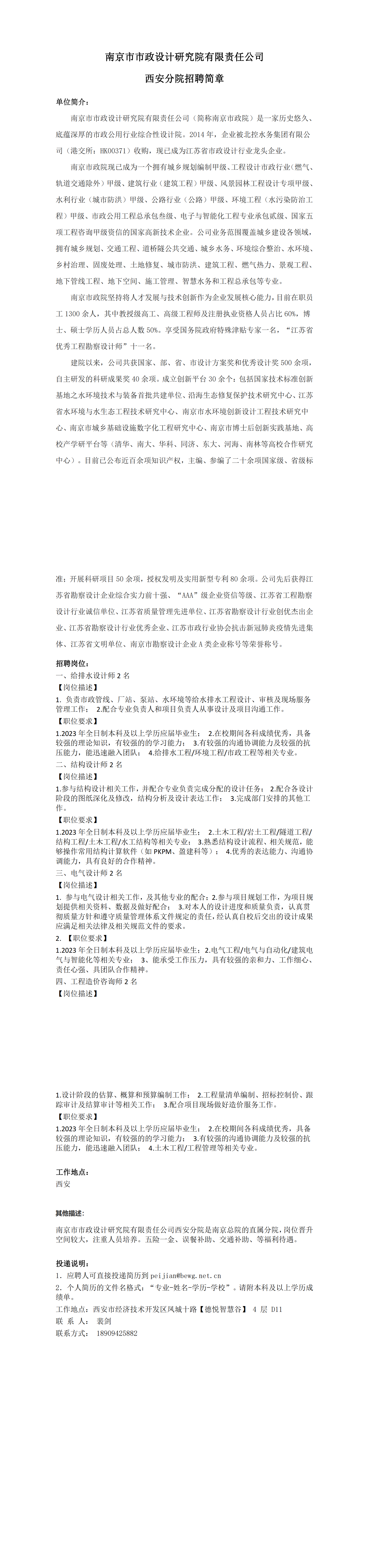 南京市市政设计研究院有限责任公司西安分院招聘简章