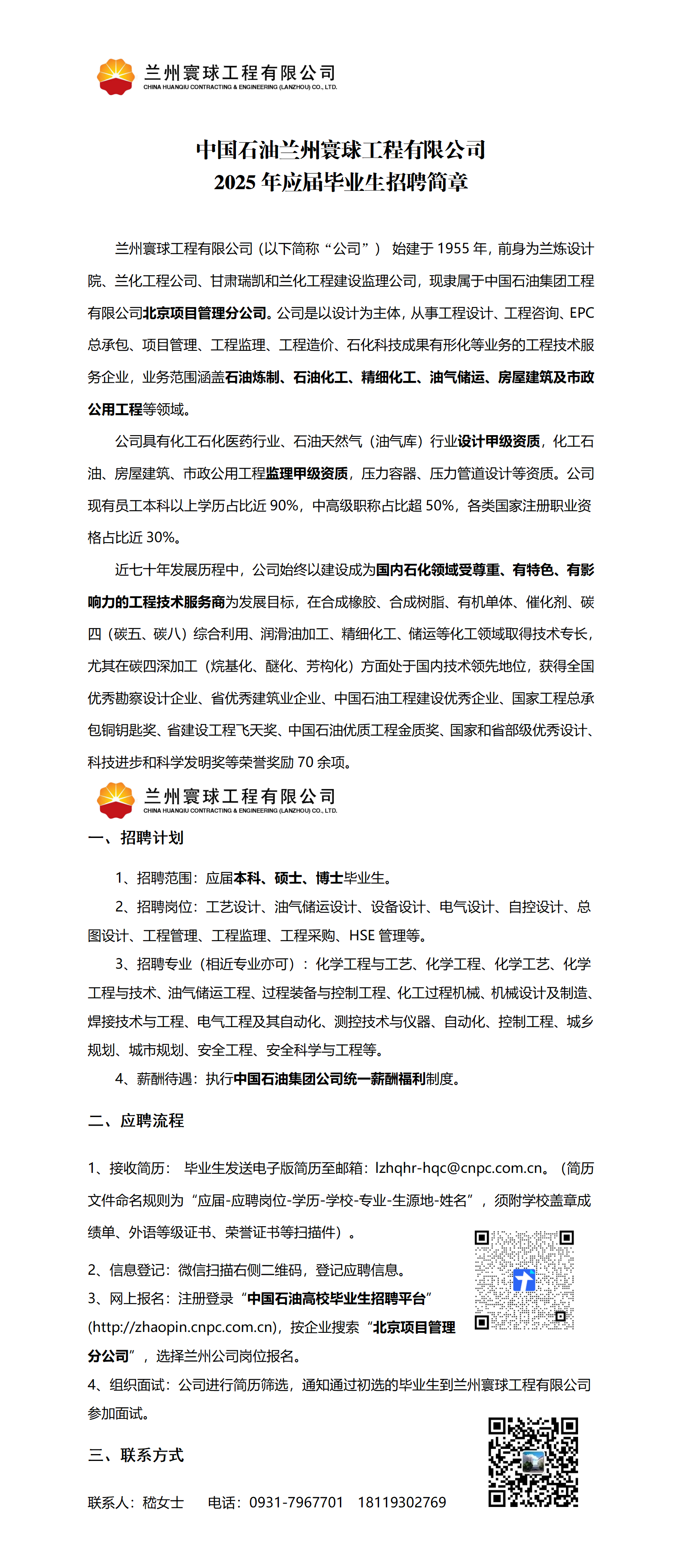 中国石油兰州寰球工程有限公司2025年应届毕业生招聘简章