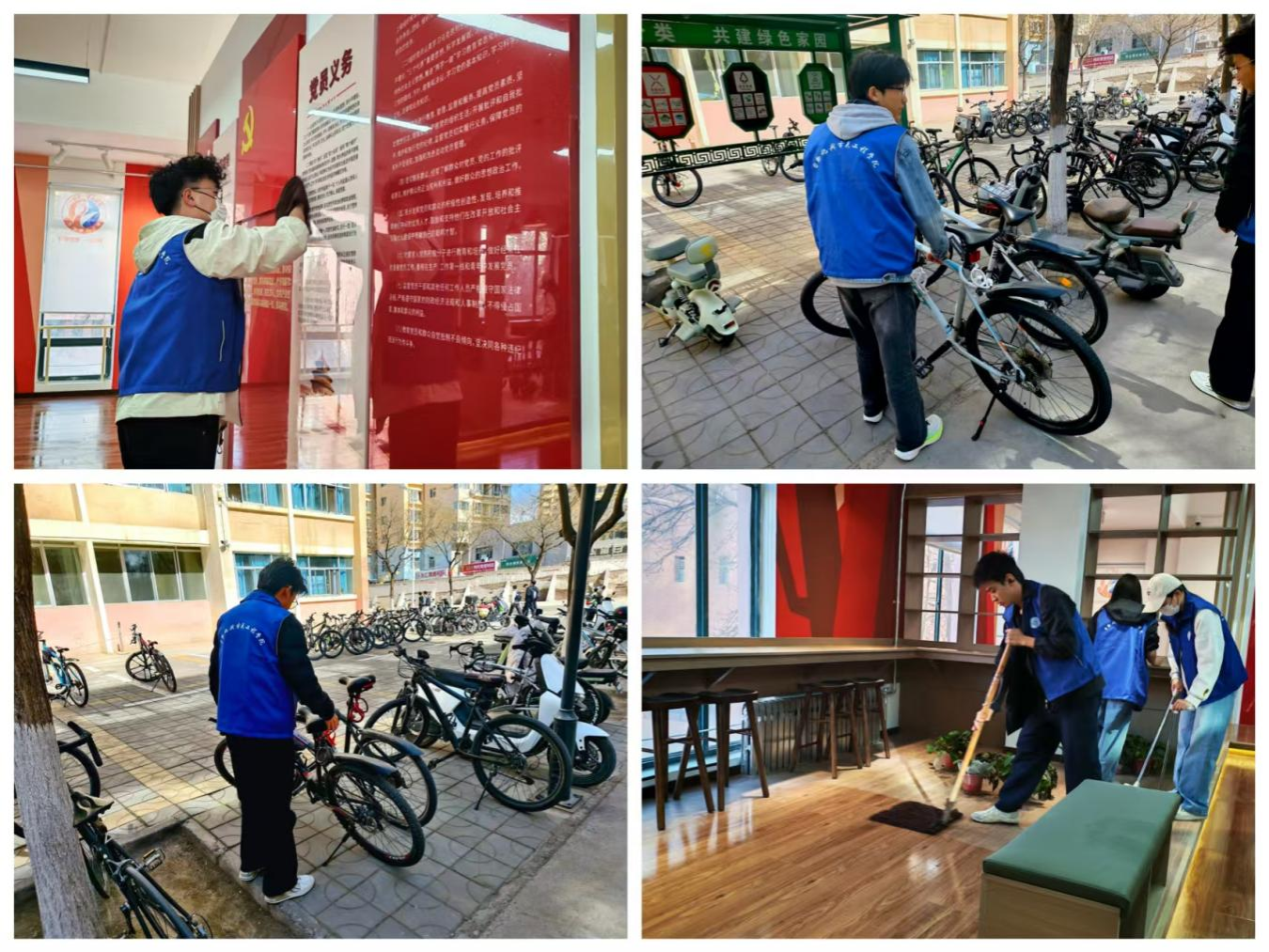 与此同时,校园环境整治工作同步展开。在西校区,志愿者们将随意停放的自行车一一摆放至指定区域,原本杂乱的停车点变得井然有序;在南村EG宿舍,大家拿起扫帚、抹布,对连廊公共区域进行深度清洁,让宿舍环境焕然一新。点滴行动,传递着对校园的热爱与责任。